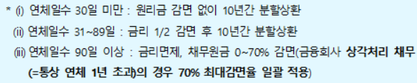 - 연체기간에 따라 차등화하여 금리감면, 대출원금 감면(연체 90일 이자만 해당, 상환곤란도에 따라 0~70%), 불할상환 등을 지원합니다.